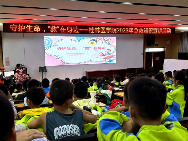 活动中,台上的志愿者们利用充满童趣的幻灯片展示,让应急救护知识更直观地深入小学生心中;主讲人以通俗的语言描绘具体做法,来自桂医红十字会的志愿者们配合模型逐步演练,让急救技能操作更加容易被学生们接受;台下的志愿者亲切地与学生们互动,耐心回答同学们所好奇的急救知识问题,帮助他们了解更多急救知识。来自崇文小学的150余名小学生倾听了宣讲,并参与了实操,现场井然有序,气氛热烈。