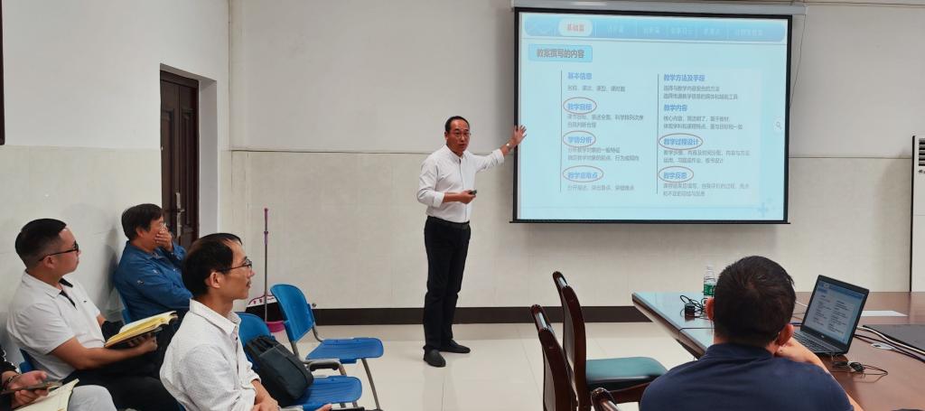 本次培训主讲人为自治区高校课程思政教学名师、细胞与遗传学教研室主任付灿副教授。他以“OBE理念指导下的教学设计规范撰写”为题,详细介绍了教学设计撰写的基本步骤和原则,阐述了教学设计中教学目标、学情分析、教学重难点、教学过程设计、教学反思等模块具体内容和撰写过程的注意事项。同时,他结合自身授课经验和参加不同类型教学竞赛的经历,启发教师从整合性、具象化、高阶性三个方向进行教学创新。会上,专任教师针对如何做好教学设计展开了热烈的讨论。