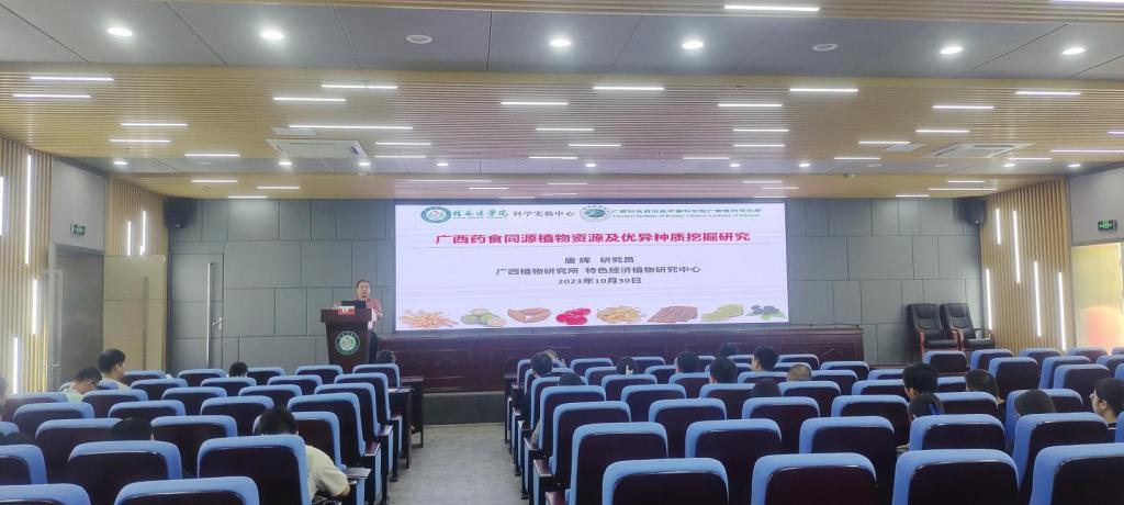 姜广建教授以“基于系统生物学分析的二型糖尿病中医证型基础及临床研究”为主题进行了学术报告,阐述了通过生物信息学分析等现代化技术手段对二型糖尿病各中医证型相关的生物分子和药物靶点进行筛选,对二型糖尿病中医证型和诊疗手段进行系统性科学验证,为完善二型糖尿病各中医证型的精准辨证施治提供科学依据。唐辉研究员以“广西药食同源植物资源及优异种质挖掘”为主题进行了学术报告,介绍了广西地方特色的瑶药、壮药中具有药食同源性的优质植物资源培育与植物品种的挖掘和保护工作。