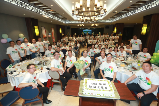 联欢合影:在象征毕业20周年聚会意义的大蛋糕前面,聚会全体师生留下珍贵的合影