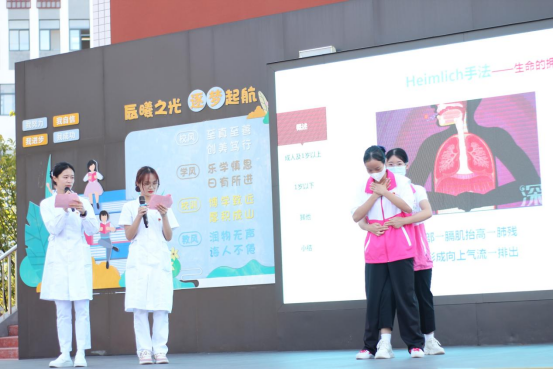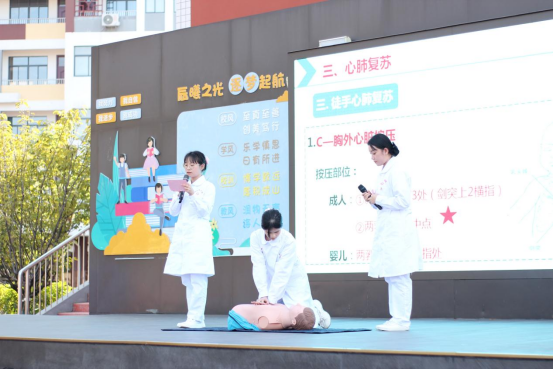 本次活动中,志愿团队发挥护理专业优势,结合临床实践经验,用通俗易懂的语言和娴熟的手法进行急救基本知识讲解和现场操作示范,让老师和学生们了解并掌握心肺复苏、海姆立克急救法等救护知识与技能。志愿团队还借助人体模型,向大家生动演示胸外按压、开放气道、人工呼吸等心肺复苏各个环节的操作步骤和要点。