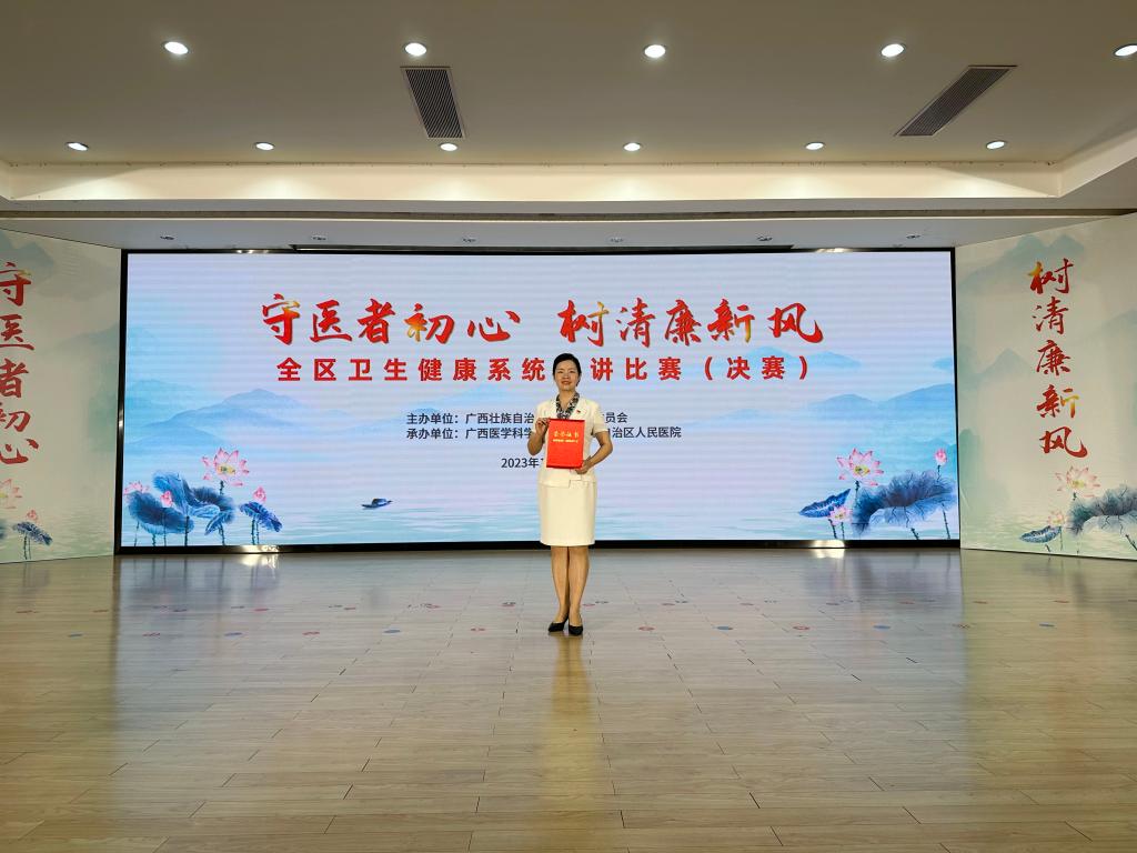 近日,由自治区卫生健康委员会主办的自治区卫生健康系统“守医者初心 树清廉新风”演讲比赛(决赛)在南宁举行,全区共72家单位报送参赛作品106个,附属医院报送的演讲作品《做一棵清廉执着昂然绽放的苔花》,在激烈的初赛中脱颖而出,顺利入围决赛。决赛现场共有20名来自区内不同医院的选手进行现场展示。王彦妮代表附属医院参加决赛,经过激烈的角逐,荣获优秀奖。