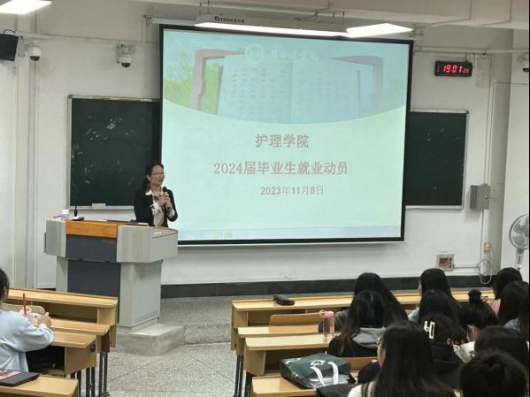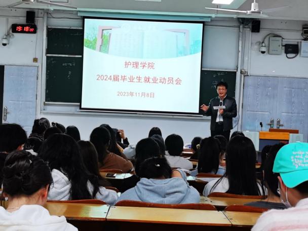 为扎实做好2024届毕业生就业指导与服务工作,帮助学生了解就业形势,把握就业机会,做好就业与职业规划,提高毕业生就业竞争力,11月8日晚,护理学院以班级为单位,通过线上线下相结合的方式,召开2024届毕业生就业动员会。护理学院党委书记秦媛、副书记谢勇志分别参加线下班级的动员会。