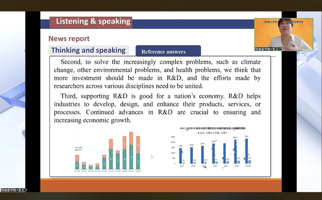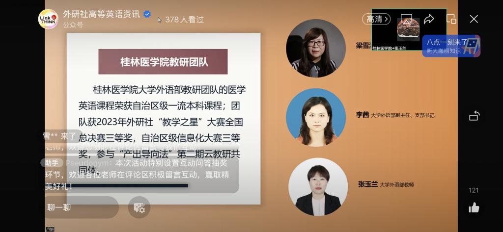 11月9日晚上,《新编大学英语》(第四版)虚拟教研室“第六期”全国性公益讲座在线上举办,桂林医学院大学外语部教研团队受邀作教学经验交流。张玉兰教师深度解读了教材的编写理念和教材特色,代表团队做课程设计分享。来自全国多所高校的一线教师在线观看讲座直播,参与互动交流,探讨基于教材的教学设计策略和教学效果。