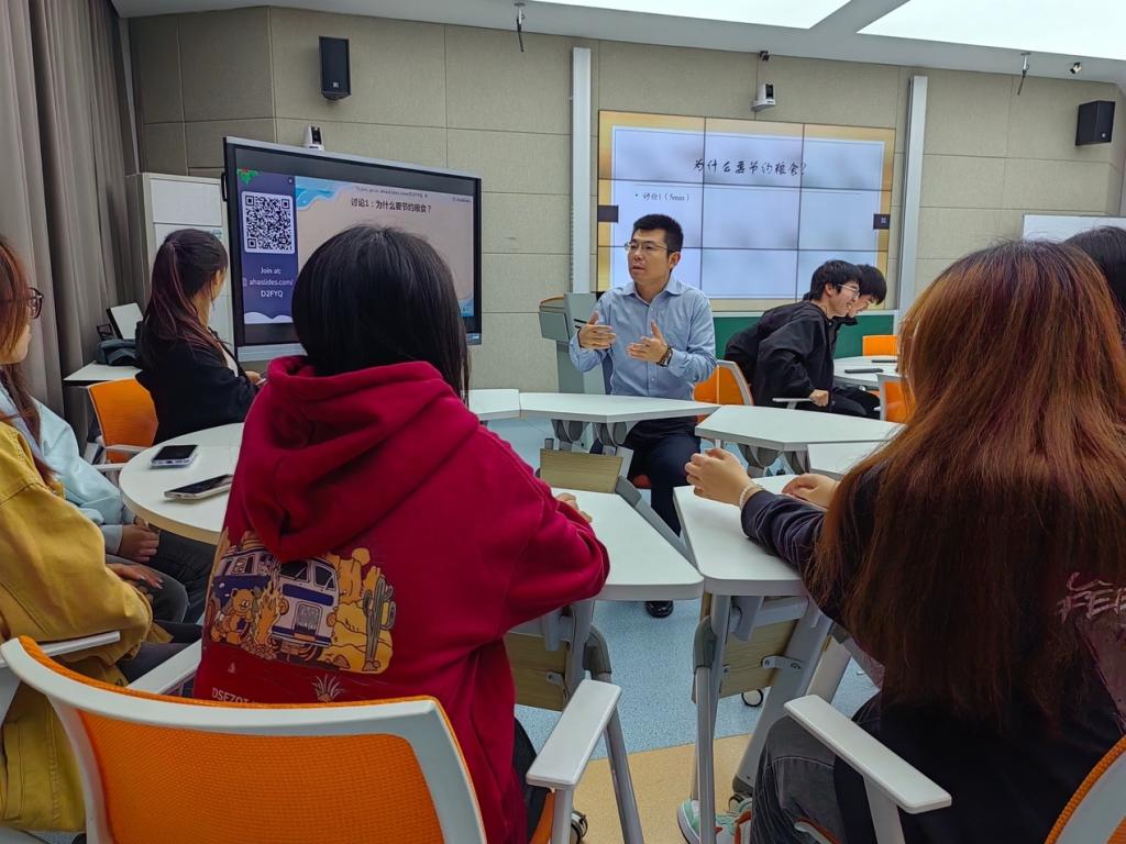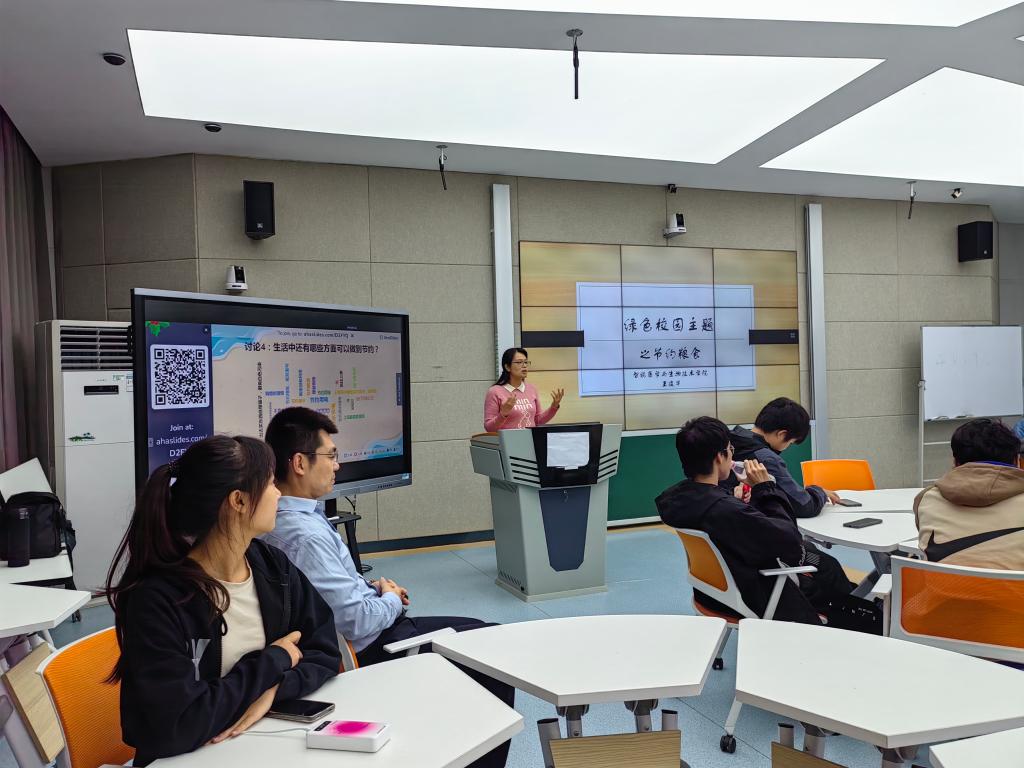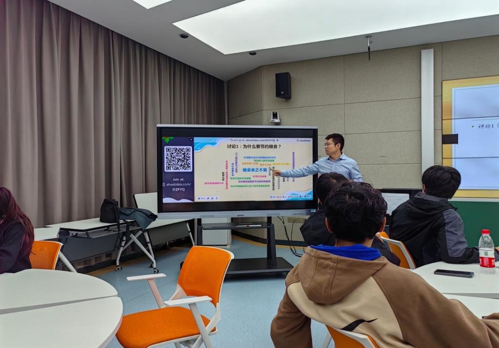 本次示范课由班主任王凌宇主讲。班会以“绿色校园之节约粮食”为主题,以“重在行动,贵在落实”为理念,以诗歌《锄禾》为导入展开。班会课充分利用了智慧教室的各项功能,通过案例分析、观看视频、问题导入、小组讨论等方式,引导学生们深入思考:为什么要节约粮食?有哪些浪费粮食的行为?哪些才是正确的节约粮食行为?除了节约粮食,日常生活中还有哪些方面可以做到节约?同学们通过小组讨论,积极参与到学习过程中。同时,王凌宇利用词云大数据分析软件将同学们讨论后的结果以扫码的形式实时呈现在屏幕上,增强了师生互动性和课堂趣味性。最后,王凌宇通过带领同学们学习手势舞,增强了同学们的环保意识,再次把课堂氛围推向了高潮。