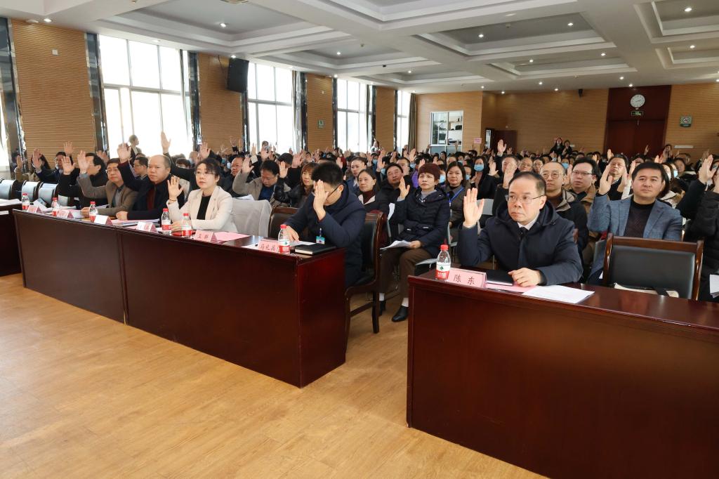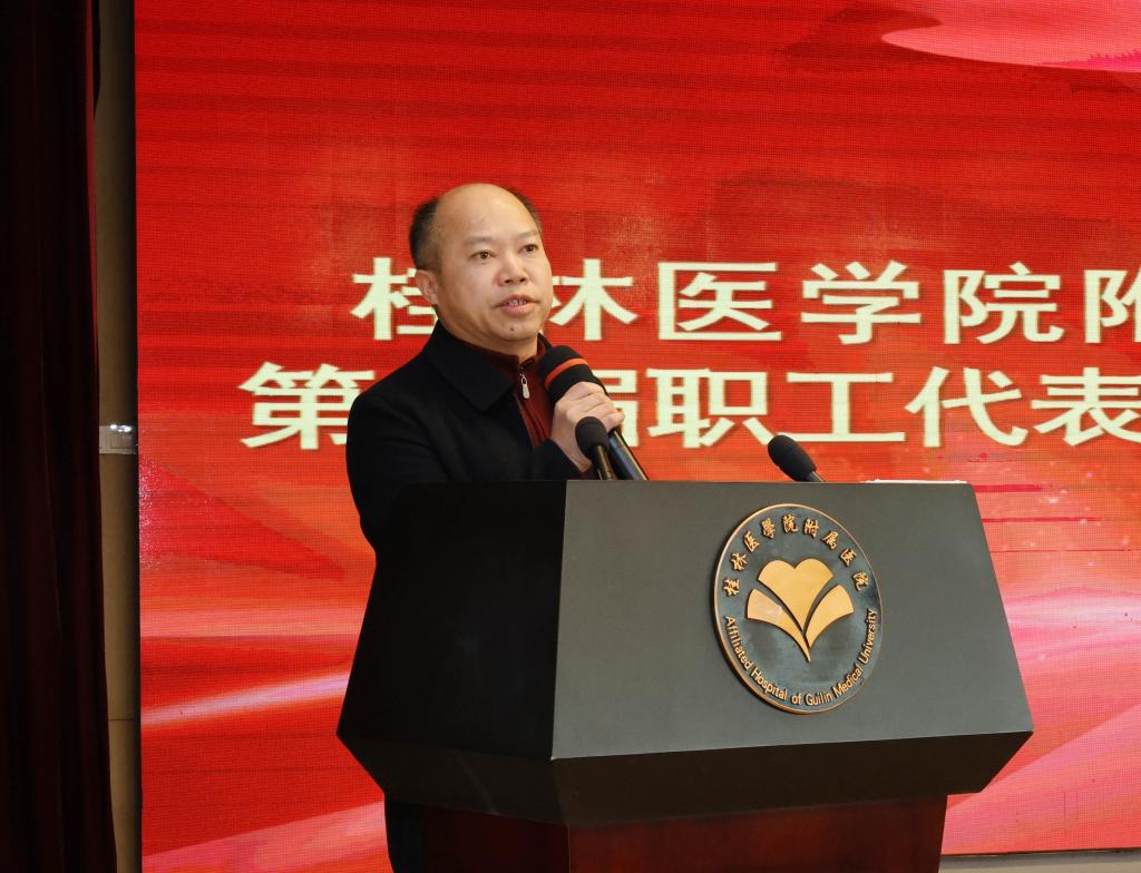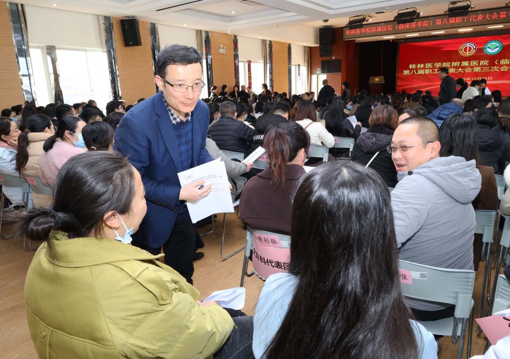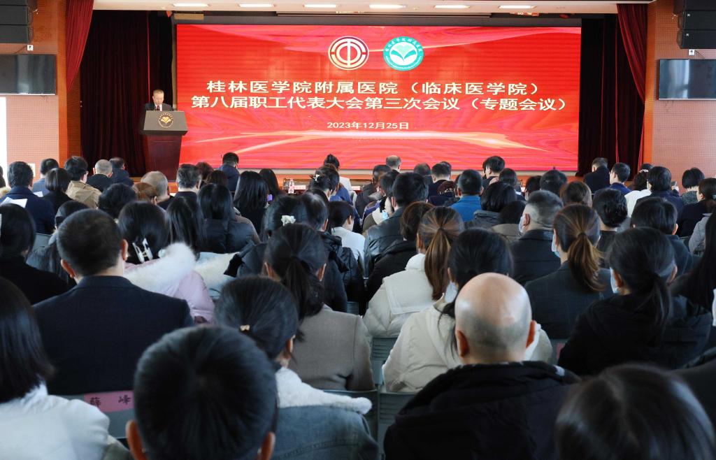12月25日下午,附属医院(临床医学院)在综合楼多功能厅召开第八届职工代表大会第三次会议(专题会议),医院党政领导班子和职工代表共240多人参加会议,听取漓东院区一期工程建设进度汇报和讨论、审议启动漓东院区二期工程相关事宜。会议由附属医院副院长王群主持。