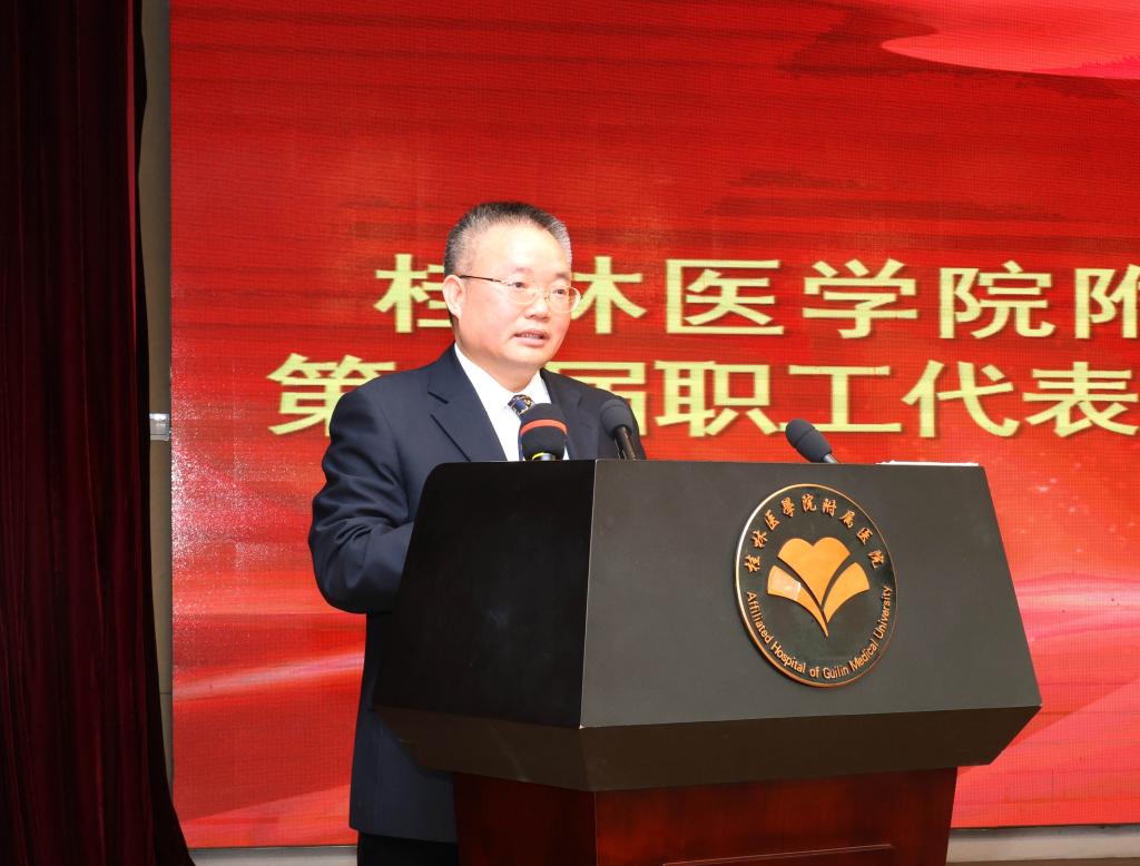 附属医院党委书记覃克强作总结讲话。他说,空间问题严重制约了医院的发展,也限制了众多人才大展拳脚,全院干部职工深有体会,今天全体代表以战略高度和长远的目光看待医院发展,全票通过启动漓东院区二期工程的决议,令他十分欣慰和感动。他代表全院干部职工感谢各位代表对医院建设发展的大力支持。