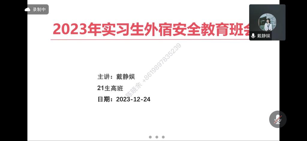 辅导员通过召开线上班会,对全体实习生进行安全教育。辅导员传达了学校关于学生外宿的管理规定,提醒学生要完善外宿手续,遵守相关规定,强调要重视消防安全、交通安全,预防一氧化碳中毒,防范电信网络诈骗,时刻关注自己的身心健康和财产安全。