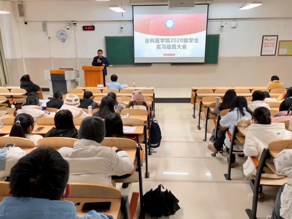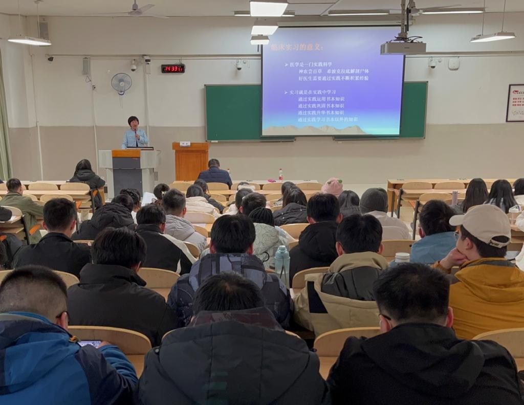 全科医学院院长郑楚进行了实习总动员。为同学们讲授了《如何做好一名优秀的实习医生》。她强调了学院对实习工作的重视,告知实习生应该尽早完成自身身份的转变,明确实习的目的和任务,尽快适应新的学习环境。牢记几个安全:医疗安全、学习安全、生活安全。严格遵守学校和实习单位的规定,遵守各种规章制度,操作常规和规范,杜绝医疗差错、事故的发生。严格要求自己;并以自身经历告诫同学们在实习阶段应积极主动学习,要善于反思、总结,将学到的知识内化成为自身的核心竞争力。在对待患者方面要换位思考,多一些人文关怀,努力成为一名合格的实习医师。