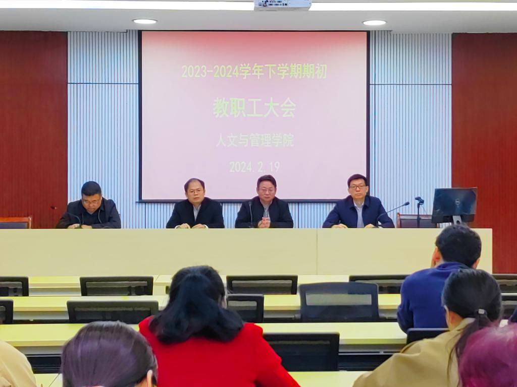 2月19日上午,人文与管理学院在人文楼218会议室召开2023-2024学年下学期期初教职工会议,会议由院长石武祥主持,学院领导班子成员、全体教职工参加。
