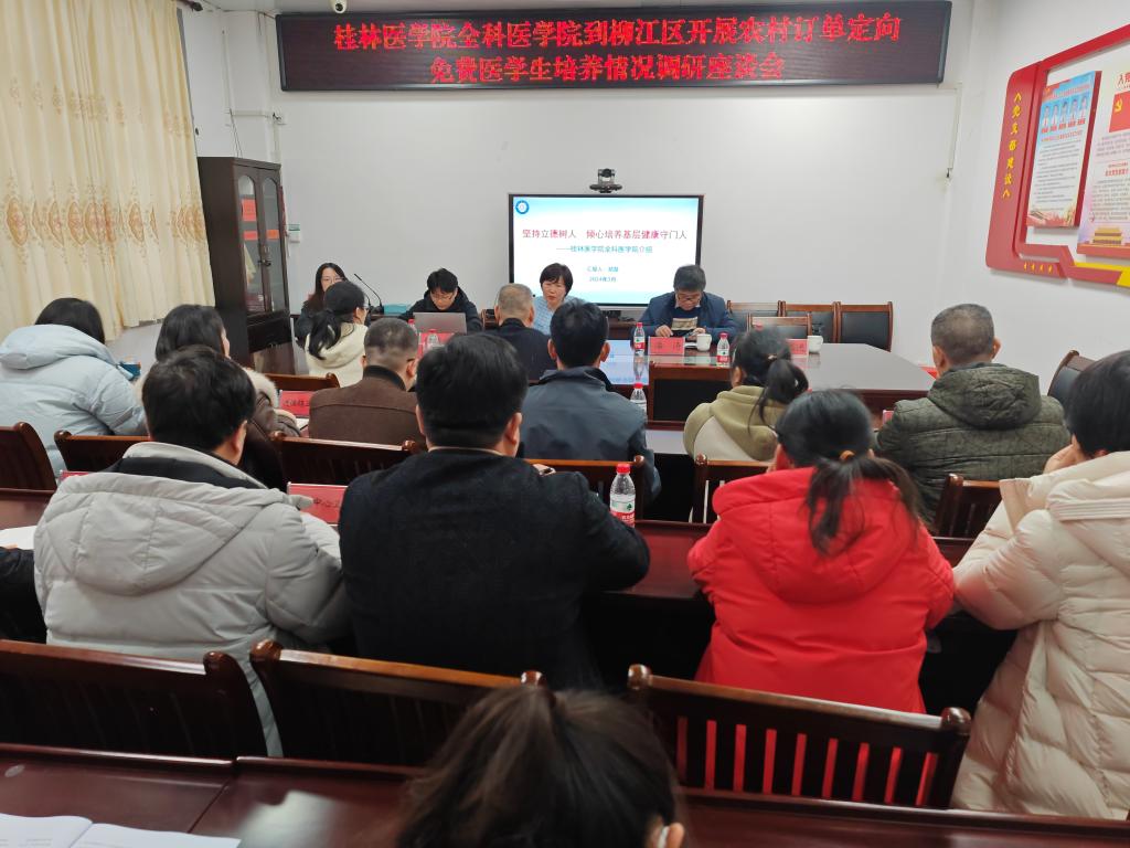 为深入贯彻落实党中央、国务院和自治区党委、政府关于高校毕业生就业工作的决策部署,落实《教育部办公厅关于开展全国高校书记校长访企拓岗促就业专项行动的通知》精神,了解柳州市柳江区农村订单定向免费医学生的现状及未来发展趋势,推进农村订单定向免费医学生人才培养工作,为健康广西建设贡献力量。2024年3月4日,全科医学院院长郑楚一行5人前往柳州市柳江区开展访企拓岗促就业专项行动,柳州市柳江区卫健局局长韦守宜、相关科室负责人、部分乡镇卫生院负责人及全科毕业校友参与调研座谈。