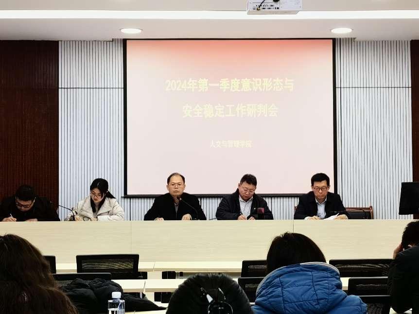 3月5日下午,人文与管理学院在人文楼218室召开2024年第一季度意识形态与安全稳定工作研判会。学院全体教职工参加会议,会议由学院党委书记庞伟毅主持。
