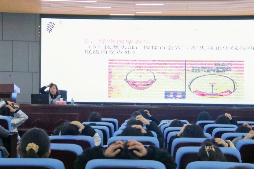 讲座中,林燕从女性各阶段生理特点、妇科常见病、多发病的预防和治疗等方面,结合丰富的临床经验进行了生动地讲解;强调了中医在女性保健中的重要地位,提倡女性朋友们要养成良好的饮食习惯,定期进行体检,合理安排作息,注重情志调节。同时,她还特别介绍了如何通过按摩保健穴位来调理气血运行,增强身体免疫力,并现场指导在场的师生们进行穴位按摩,让大家亲身体验了中医保健的魅力。