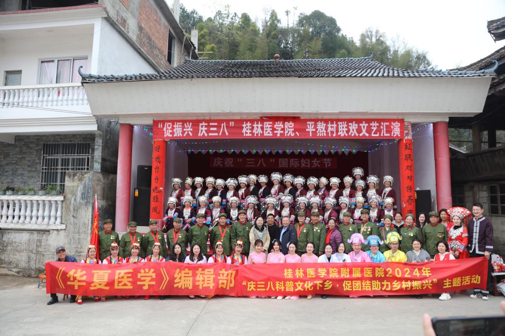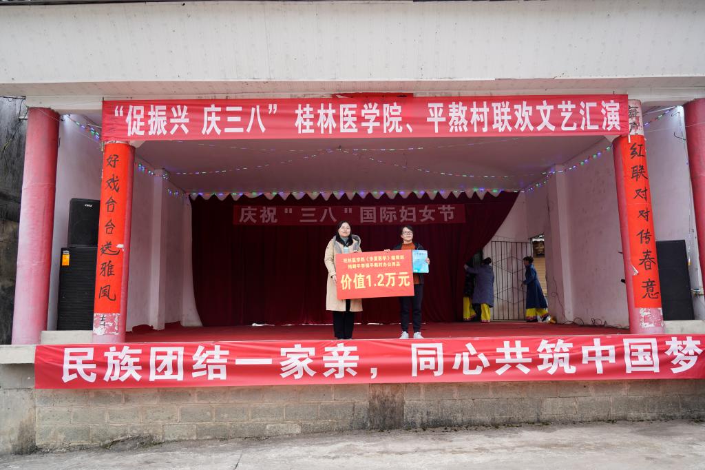 中午,一场主题为“民族团结一家亲,同心共筑中国梦”的文艺汇演将庆祝活动推向了高潮。附属医院团委、老兵艺术团和平熬村村民,通过琵琶弹唱、歌舞、科普情景剧等多种形式,共同表达了民族团结的深厚情谊和共筑中国梦的坚定信念。其间,《华夏医学》编辑部代表桂林医学院向平熬村捐赠价值1.2万元的办公用品和2023年期刊1套,并向女同胞们致以节日的问候。
