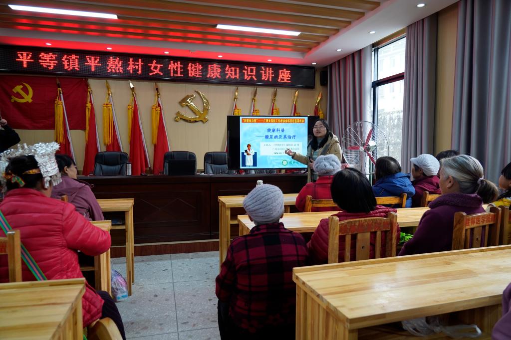 首先,《华夏医学》编辑部涂剑教授同时代表广西女科技工作者协会为村民们尤其是女同胞带来了一场以“糖尿病及其治疗”为主题的健康知识科普讲座。讲座中,涂剑教授以通俗易懂的语言结合生动有趣的案例,深入浅出地科普了糖尿病相关知识及其防治注意事项,并建议大家关注“华夏医学”公众号,实时了解如营养不良、甲亢、帕金森病等更多的健康科普知识。会场座无虚席,村民们听得聚精会神,还不时点头表示认同。讲座不仅提升了大家对自身健康的认知和重视,更为乡亲们送去了温暖的关怀和实用的健康指导。此外,附属医院的医务人员在村卫生室展开一场充满温情的“妇科疾病义诊”,为各位女性村民提供免费的健康检查和咨询服务。