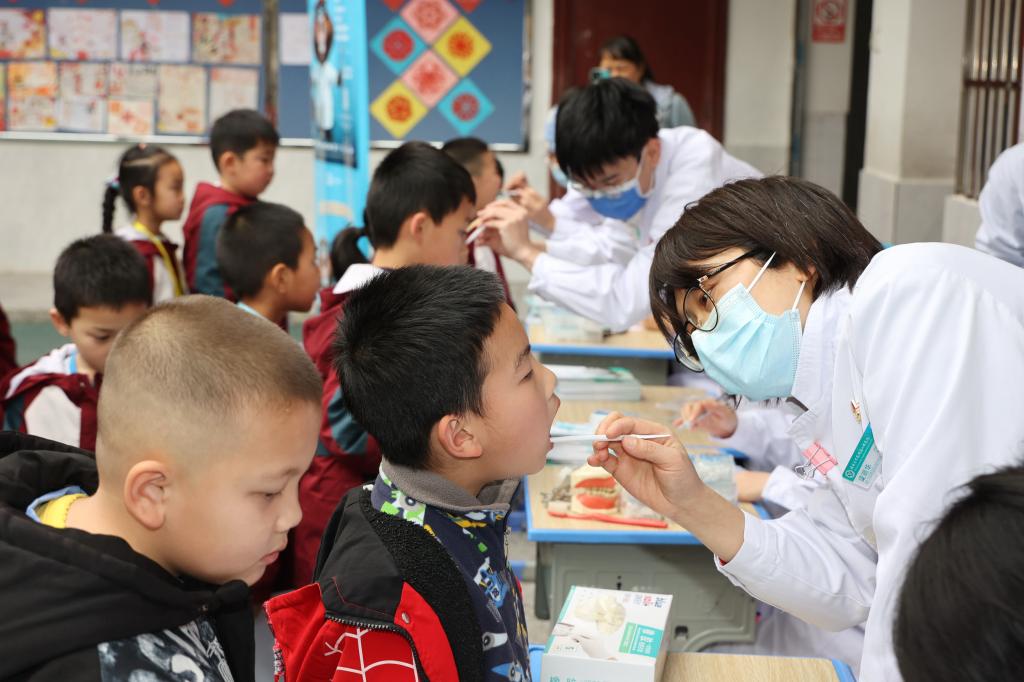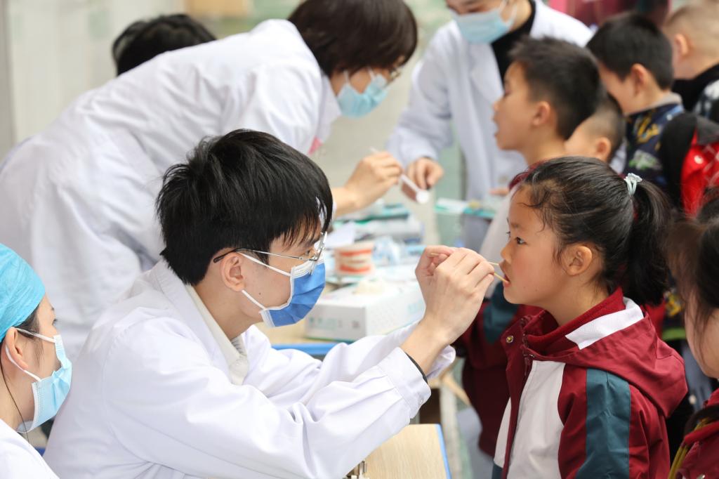 医务工作者为学生检查口腔