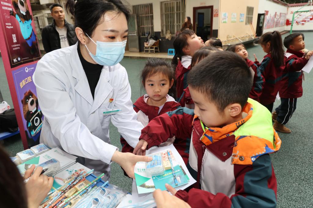 医务工作者向学生发放口腔保健宣传册和护牙用具