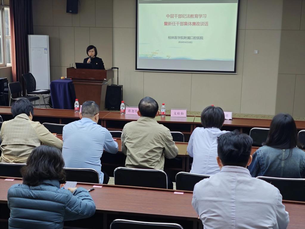为进一步增强中层干部依法履职的责任感和使命感,教育、激励、鞭策中层干部恪守宪法精神,强化履职担当,增强廉洁意识,4月10日上午,附属口腔医院(口腔医学院)举行新任职干部宪法宣誓、纪法教育学习暨集体廉政谈话,党委书记文琼仙宣读任职文件并讲话,党委副书记、院长蒋尧传领誓,党委副书记、纪委书记崔俊娜主持并开展纪律教育,全体中层干部参加。