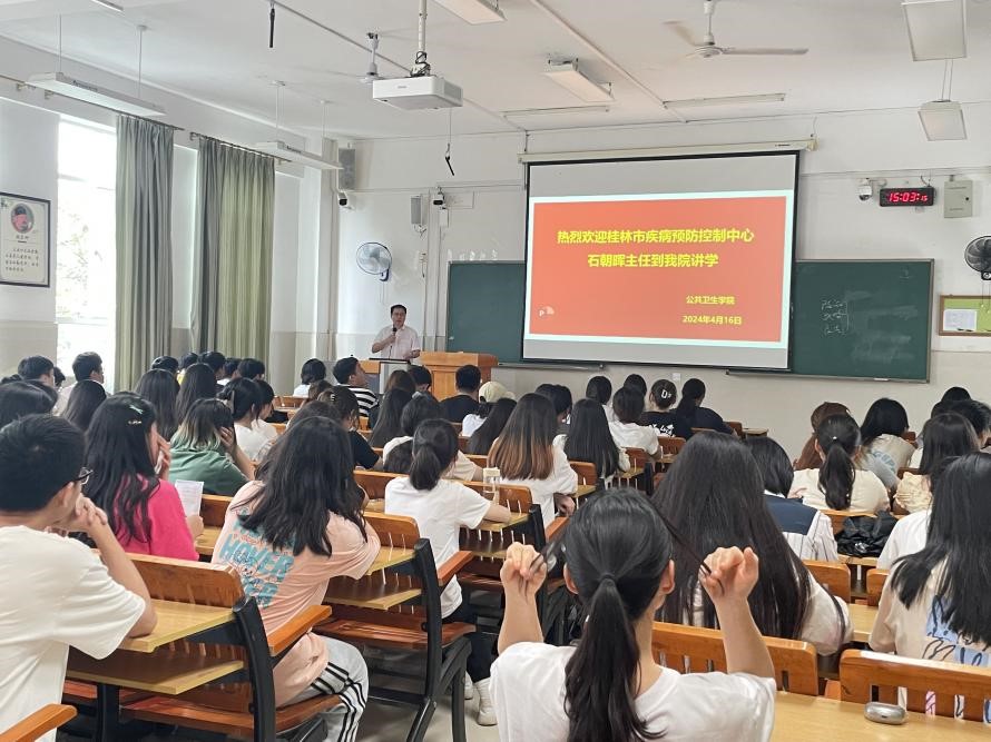 4月16日下午,桂林市疾病预防控制中心主任石朝晖在临桂校区S212教室为卫生检验与检疫专业的学生们开展了一场深刻的专业思想教育讲座。本次讲座的核心目的在于培养学生的职业责任感和提升他们在疾病预防及控制领域的专业技能。公共卫生学院副院长曾怀才,学工办全体辅导员参加了本次讲座。