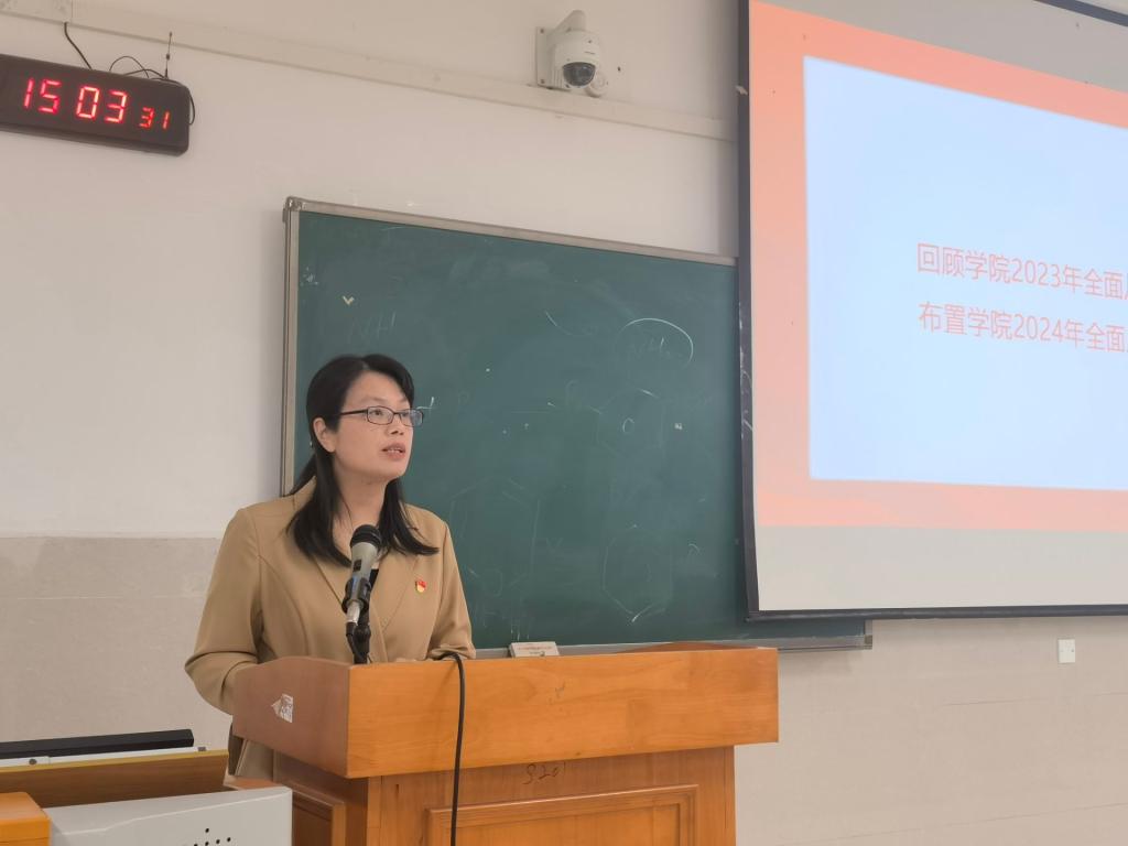 黄月圆回顾学院2023年全面从严治党工作、布置学院2024年全面从严治党及清廉学院建设工作。对全院师生提出四点要求:一是提高站位,深刻把握全面从严治党的重要意义。突出凝心铸魂深化拓展主题教育成果,突出“两个维护”深化政治监督,突出严的基调深化党的纪律建设。二是把握要义,推动全面从严治党向纵深发展。突出政治引领,持续正风肃纪反腐。三是强化措施,推动全面从严治党走深走实。在深入推进党的自我革命实践中,把握好九个问题,要坚持解放思想、守正创新。抓住领导干部这个“关键少数”,在推动以上率下上下功夫。抓住担当作为这个关键,在推动工作落实上下功夫。抓实作风改进这个环节,在建强干部队伍上下功夫。四是聚焦问题,推动党纪学习教育入心入脑。党纪学习教育要注重融入日常、抓在经常;要加强解读和培训,深化对《中国共产党纪律处分条例》的理解和运用。