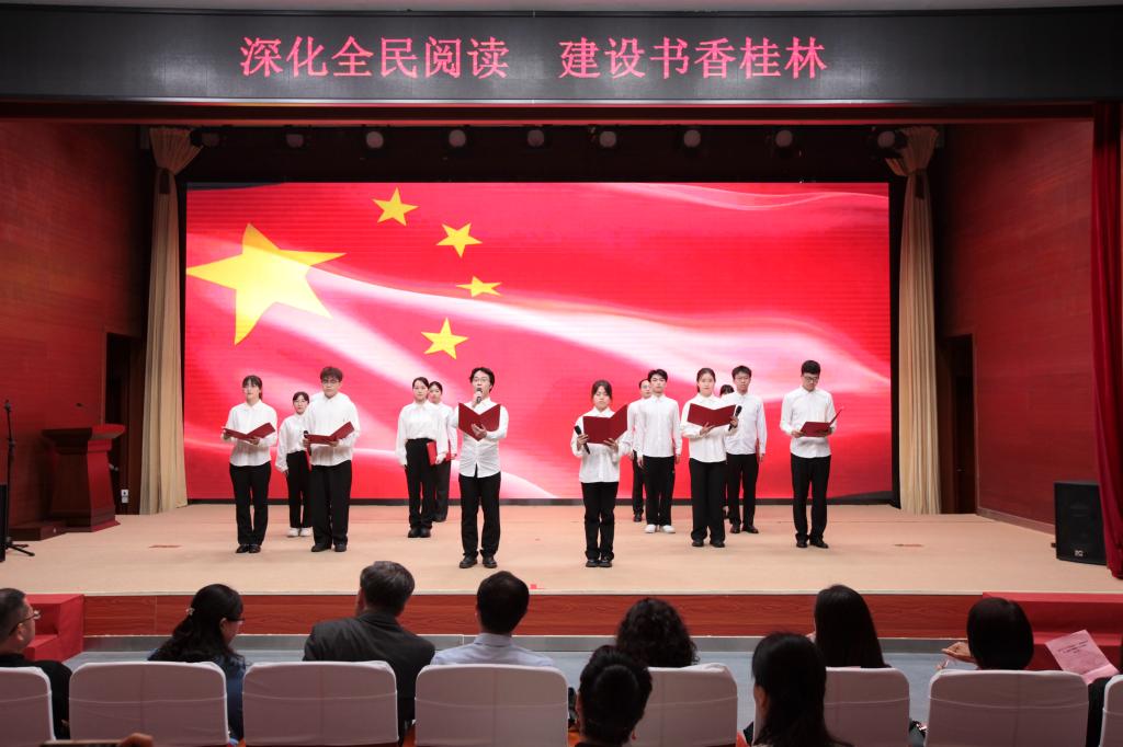 在启动仪式上,三个阅读小组分别朗诵《延安》《“两弹一星”精神颂》《盛世中国》等阅读选段,共同演绎青春热血与家国情怀,共话先辈们的青春魅力,精彩的演出赢得了现场观众的阵阵掌声。杨柳杰、敬晓娟被评为“优秀指导教师”,敬晓娟获评2023年度广西桂林图书馆“优秀志愿者”,35名同学被评为“优秀朗读者”。