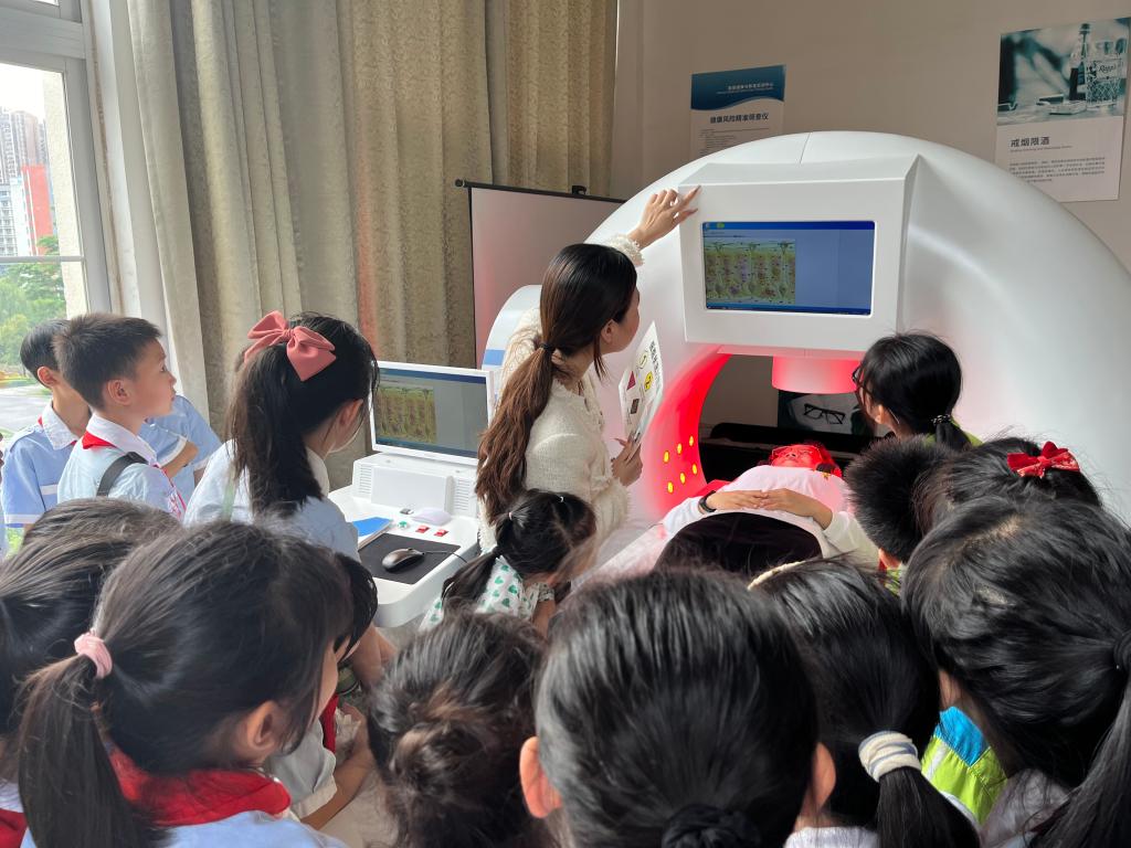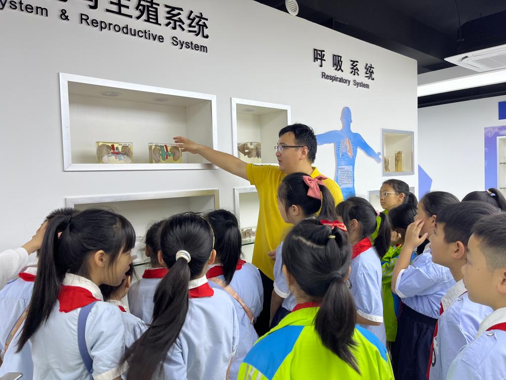 活动中,学生们参观了学院智慧健康与养老实训中心,在大学生志愿者的讲解下,对大型健康体检一体机、小型便携式健康一体机、健康风险精准筛查仪、骨密度仪、心血管功能测试仪进行初步了解和体验。随后,同学们共同参观了基础医学院人体医学标本馆,老师陈禹通过人体标本,声情并茂地引导学生认识身体结构、敬畏生命,守护自己及家人的健康,并耐心回答学生们的提问。