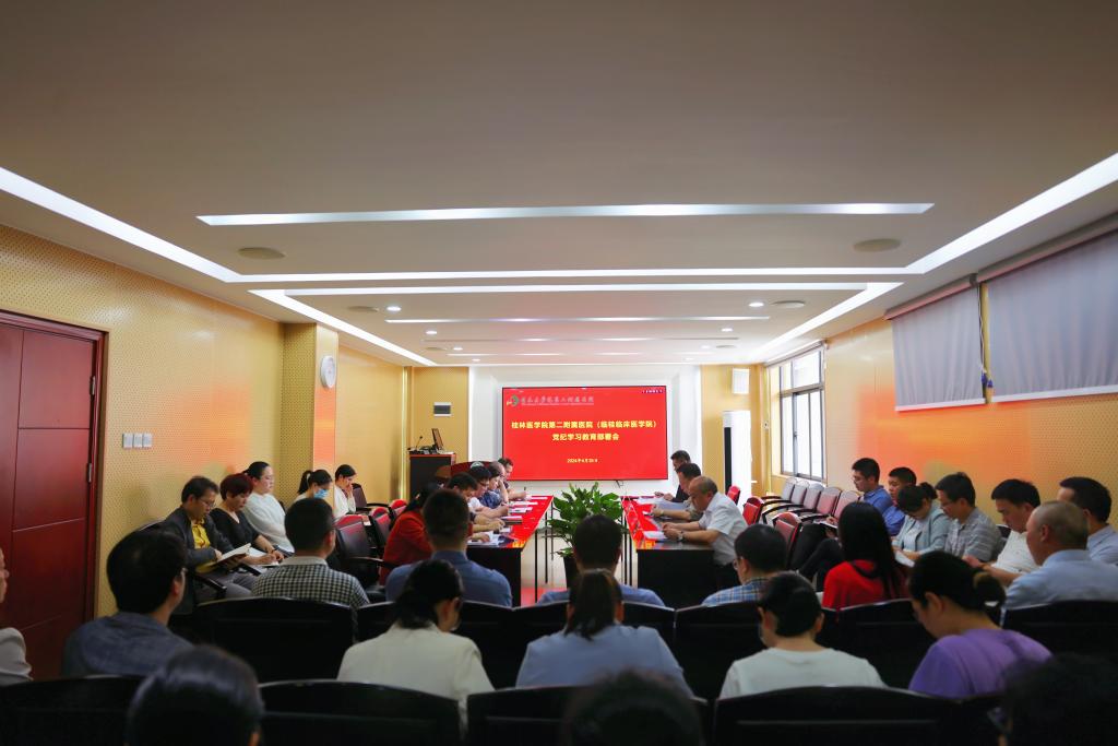 4月25日,第二附属医院(临桂临床医学院)在8号楼6楼会议室召开党纪学习教育部署会议,传达学习习近平总书记关于党纪学习教育的重要讲话和重要指示精神,认真落实中央、自治区党委、学校有关会议精神,对医院党纪学习教育进行动员部署。党委书记葛波,党委副书记、纪委书记彭鹏,党委副书记黄宇平,全体党支部书记、医院党纪学习教育专班成员参加会议,会议由黄宇平主持。