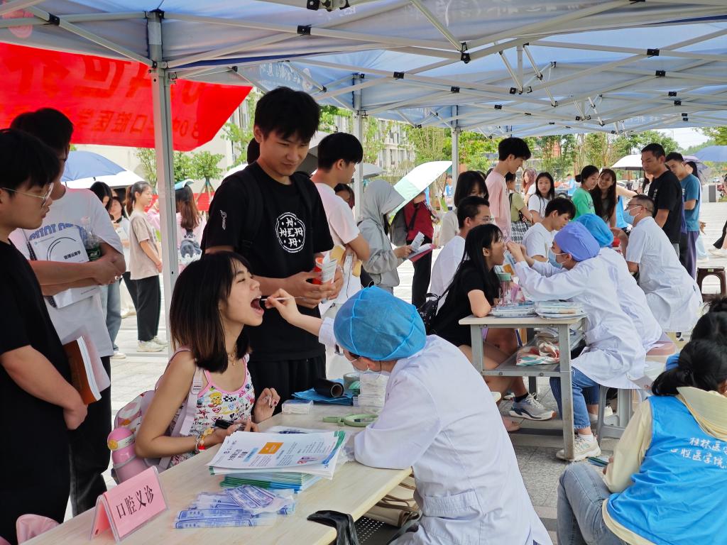 连日来,医院组织正畸科医护人员、研究生和大学生志愿者走进桂林航天工业学院和桂林信息科技学院等各高校开展口腔保健宣教和义诊活动。义诊现场,医生们耐心细心应诊,全面、专业、精准地给前来咨询的学生进行矫正及牙颌面畸形相关问题答疑解惑,志愿者们在现场示教正确刷牙方法并发放宣传单普及口腔健康知识。