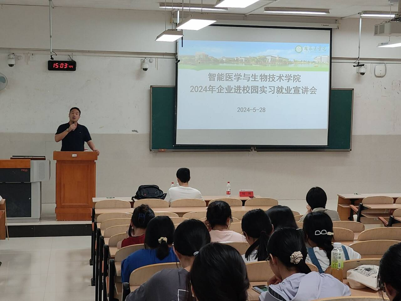 为加强学校与社会企业的合作联系,增进同学们对用人单位的了解,更好地做好个人职业选择,5月28日下午,智能医学与生物技术学院在临桂校区教学南楼S102教室举办“2024年企业进校园实习就业宣讲会”。智能医学与生物技术学院副院长刘源、学院全体辅导员以及2024年实习班级、2024届毕业班级学生参加了宣讲会。本次宣讲会嘉宾为广州杰特伟生物科技有限公司总经理马永江。