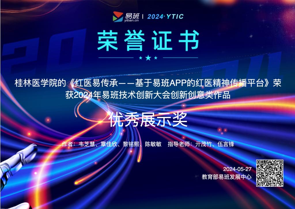 5月24日—27日,由教育部易班发展中心主办的“2024年易班技术创新大会”在海南黎安国际教育创新试验区举行。本届大会共有100余所高校、300余名师生现场参会,共有94件作品参赛。我校参赛作品《红医易传承--基于易班APP的红医精神传播平台》(作者:韦芝慧、覃佳欣、黎铭熙、陈敏敏 指导老师:亓茂竹、伍言锋)荣获创新创意类作品优秀展示奖。