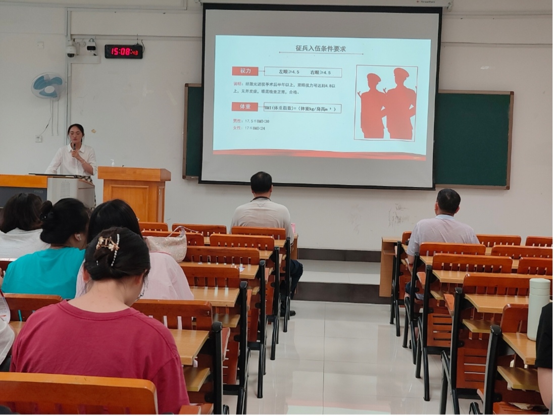 学院征兵专员为同学们详细解读2024年征兵政策。她分别从征兵入伍条件、参军的国防意义、参军的优惠政策等方面进行逐一讲解。结合往届学生的参军入伍案例,她鼓励同学们积极参军,让自己在火热军营中收获强健的体魄、亲密的战友和丰富的人生经历,希望同学们认真思考参军的经济账、成长账和人生账。