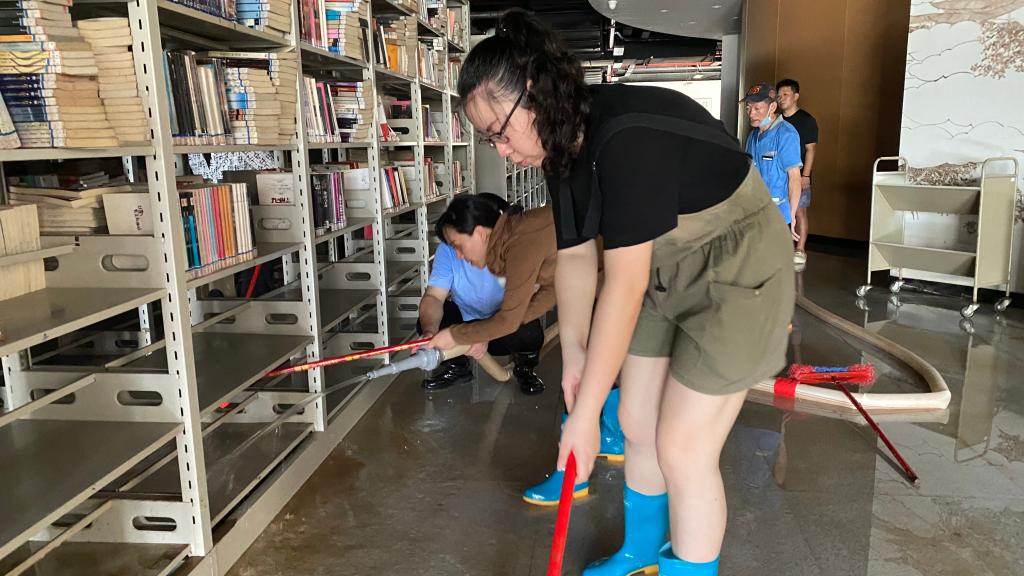 6月21日下午至6月22日,志愿者们和工作人员们一起,将一包包资料搬到户外晾晒再进行整理归档,将地板上、资料架上、桌椅上的泥浆细致清理干净,为东城校区图书馆尽快恢复开馆,资料的保全与贮存功能恢复,提供了重要的帮助。