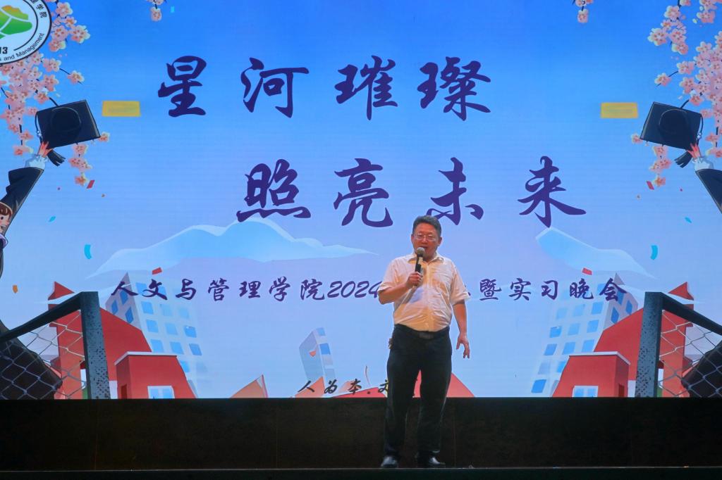 学院院长石武祥为晚会致辞。他深情回顾了同学们在校的点滴,提醒毕业生、实习生们,无论未来走到哪里,即使面临未知的挑战,也要保持对生活的热爱,始终坚守人文精神和社会责任,以坚韧的意志和不懈的努力,书写自己的人生篇章。