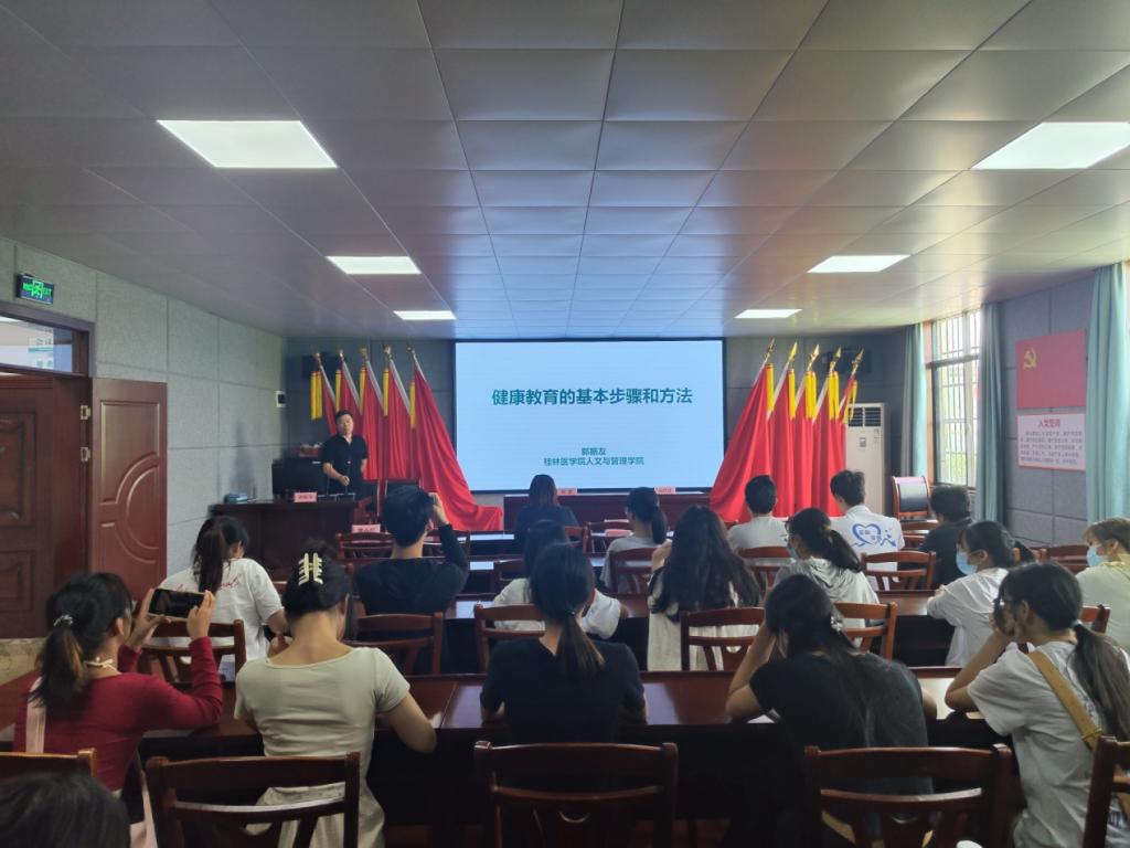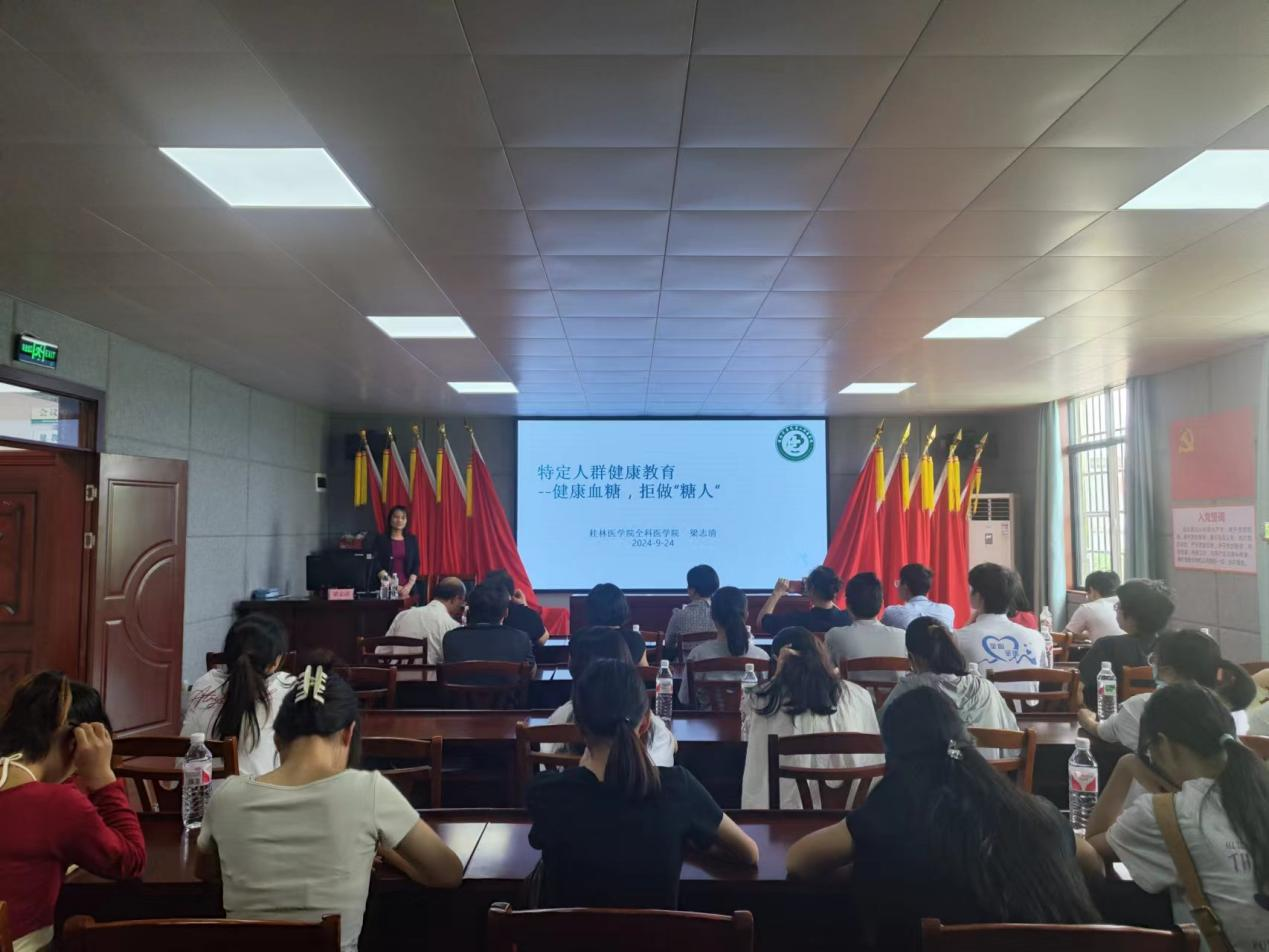 揭牌仪式后,桂林医学院人文与管理学院郭振友教授从健康教育的概念、常用的方法及其综合应用,“互联网+”时代的健康教育等方面,详细讲述了健康教育工作的基本步骤与教学方法。梁志清教授以《特定人群健康教育——健康血糖,拒做“糖人”》为题,以糖尿病为例,从疾病的临床表现、诊断、治疗和最新学科研究进展等方面,结合个人长期临床工作和援非医疗经历,就如何开展儿童、妇女和老年人等特定人群的健康教育进行讲解。一个多小时的讲座精彩纷呈,让在场师生、卫生院医务工作者、乡村医生收获颇丰。