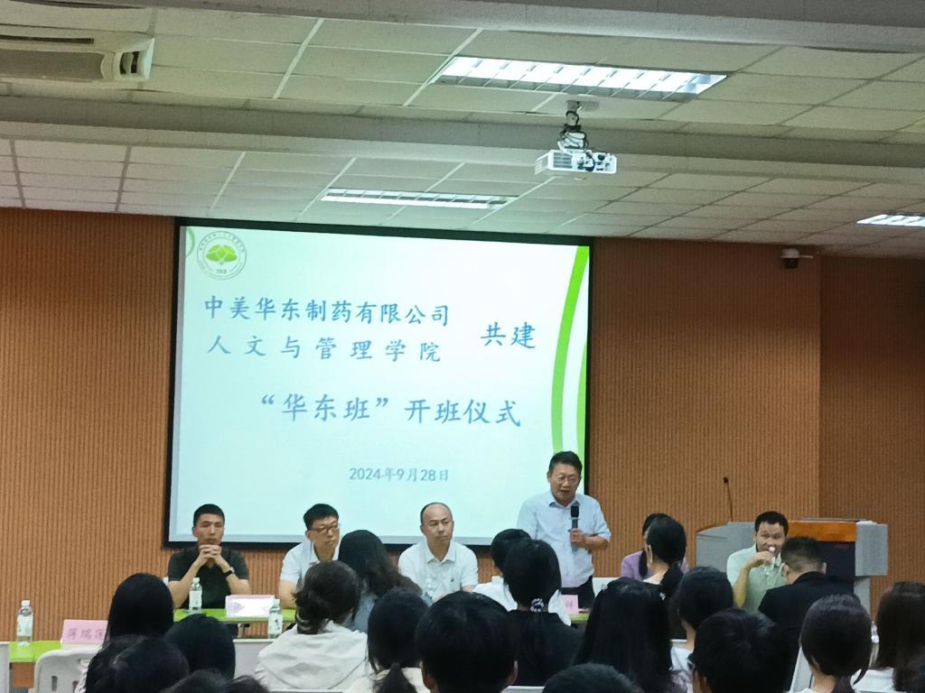 为深入推进校企合作,探索校企联合育人新模式,提升学生职业竞争力,9月28日,杭州中美华东制药有限公司与人文与管理学院共建“华东班”在临桂校区大学生活动中心开班。杭州中美华东制药有限公司内分泌产品总监熊威、行政大区经理张琨等一行、学院院长石武祥、副院长苗耀祥及学工办负责人、辅导员、2024级市场营销(医药方向)本科班学生参加开班仪式。仪式由学院党委副书记、纪委书记周小群主持。
