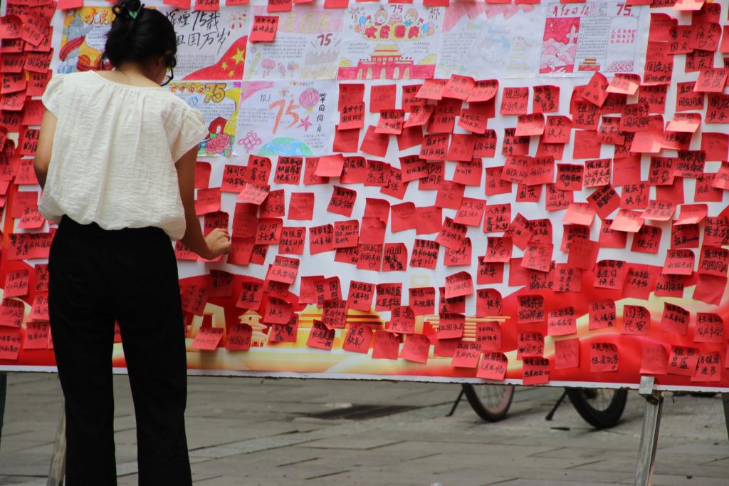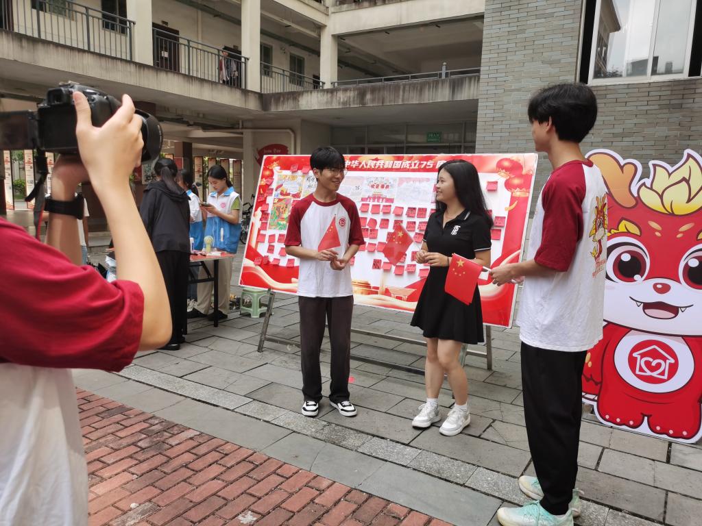 活动设计巧思、富于内涵,设置有手抄报征集展评、历史人物解读、好运乒乓球赛、反转大脑挑战、记忆翻牌冒险等,融知识学习、娱乐互动为一体。活动展台以五星红旗和国庆主题气球为主要装饰,“一站式”学生社区更新“新中国成立75周年”主题宣传21张,营造出浓厚的中国式节日氛围。活动还开展了采访献祝福、国庆祝福墙留言活动,学生在镜头前大方表白,深情祝福伟大祖国;在留言墙上认真书写祝福,一笔一划尽显家国情怀。迎国庆系列活动共吸引1000余名学生参加,活动成效良好。