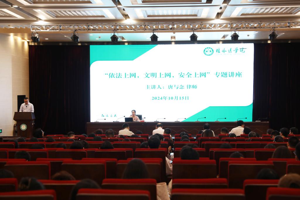 10月15日下午,由党委宣传部和学生工作部(处)联合举办的“依法上网,文明上网,安全上网”专题讲座在我校临桂校区教学北楼多功能报告厅举行。学校法律顾问、广西嘉合律师事务所合伙人唐与念律师作专题讲座。党委宣传部、学生工作部(处)等相关部门工作人员,全体专兼职辅导员、学生代表等200余名师生到场聆听。