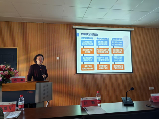 胡雁以“干预性护理研究中干预方案的开发和实施”为题,详细介绍了干预性护理研究在提升护理质量、改善患者结局方面的意义,讲解了跨学科交叉研究的含义与科研方法。随后,胡雁与在座的师生代表进行了深入探讨、交流。
