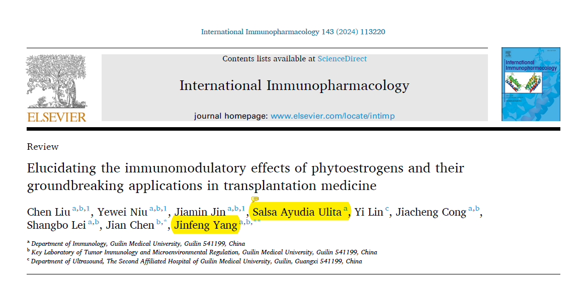 近日,我校国际教育学院的来华留学生所在的科研团队传来振奋人心的消息,他们在知名学术期刊《Internal Immunopharmacology》上发表了一篇题为《Elucidating the immunomodulatory effects of phytoestrogens and their groundbreaking applications in transplantation medicine》的综述文章。此次论文的发表,是我校有规划、有目的地采取有力措施,实施来华留学本科生科研导师制及科研能力提升计划取得的积极成果,有力地推动了我校留学生教学、科研工作。
