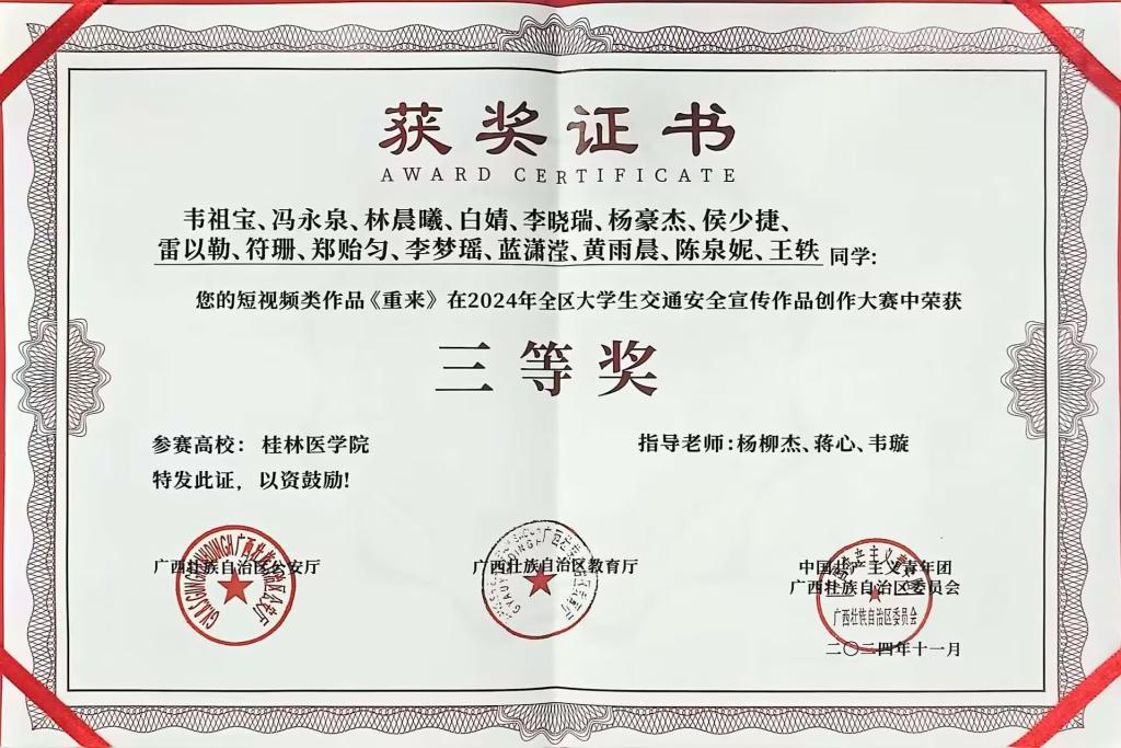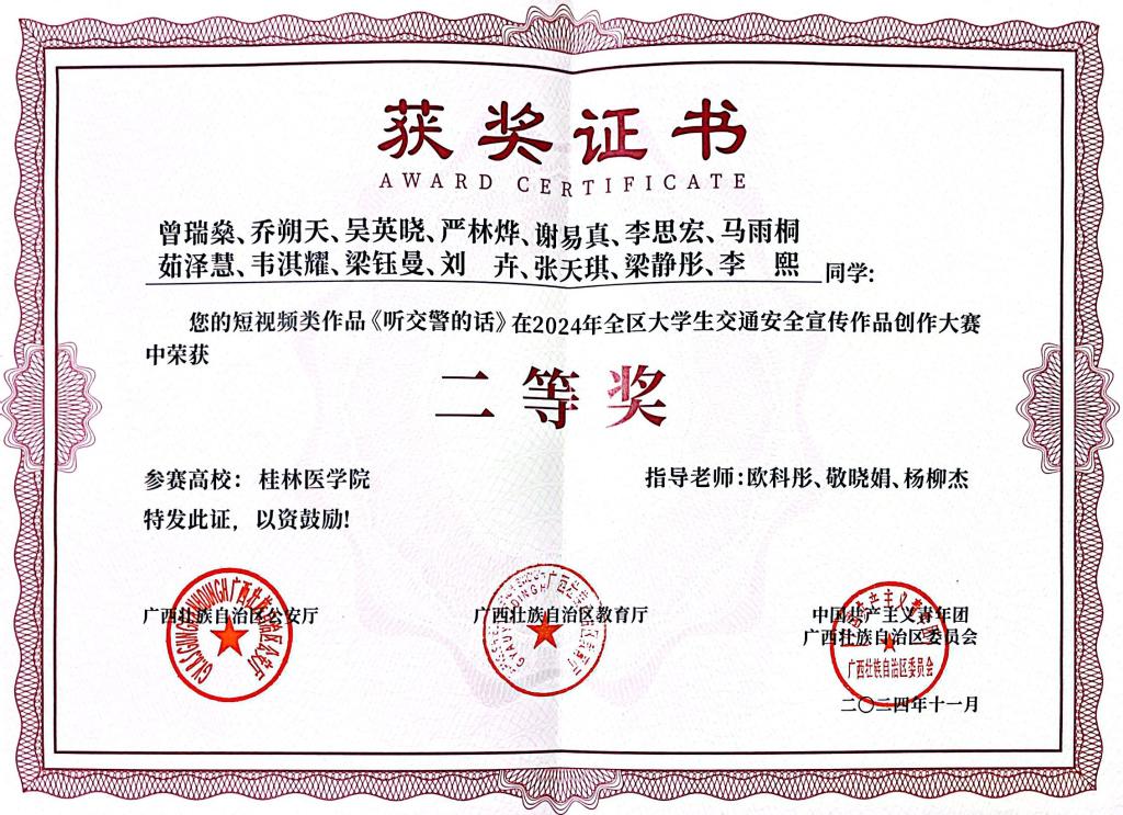近日,由自治区公安厅、教育厅、共青团广西区委联合开展的2024年全区大学生交通安全宣传作品创作大赛获奖名单公布,我校短视频类作品《听交警的话》(负责学生:曾瑞燊,第一指导老师:欧科彤)荣获大赛二等奖。作品《重来》(负责学生:韦祖宝,第一指导老师:杨柳杰)荣获大赛三等奖,学校获评优秀组织单位。