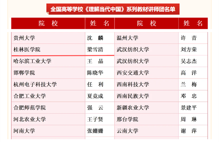 梁雪清表示,此次入选全国高等学校《理解当代中国》系列教材讲师团,使其有了与全国优秀外语教师们共探数智赋能新思路,切实提升“三进”教学成效的宝贵机会。作为广西4位入选的外语教师之一,她将带领教学团队积极参与到系列教材的推广与研讨活动中,不断深耕课堂思政建设,以创新思维赋能教育教学,为全国高校教师提供教学示范与经验分享,助力提升高校学生对当代中国的全面认知与理解,进一步促进高校思想政治教育与专业教学的有机融合,为培养具有家国情怀、国际视野、创新精神和实践能力的新时代人才贡献力量。