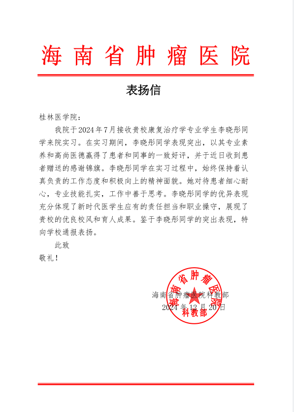 近日,海南省肿瘤医院向学校发来表扬信,表扬康复医学系康复治疗学专业实习生李晓彤,肯定了我校的优良校风和育人成果。