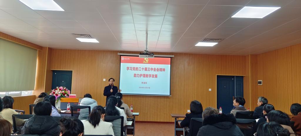 李清华以《学习党的二十届三中全会精神,助力护理教学发展》为题,用党的历届三中全会主题和重点作为开篇,紧紧围绕进一步全面深化改革、推进中国式现代化、全面准确理解《决定》重点等方面作了系统、生动地阐释和解读。同时,他结合护理学院学科专业实际,详细阐述了护理教育全面深化改革的建设思路和未来发展格局。报告脉络清晰、重点突出、切合实际,既有理论高度,又有实践深度,对大家准确把握全会精神并抓好贯彻落实具有很强的指导意义。