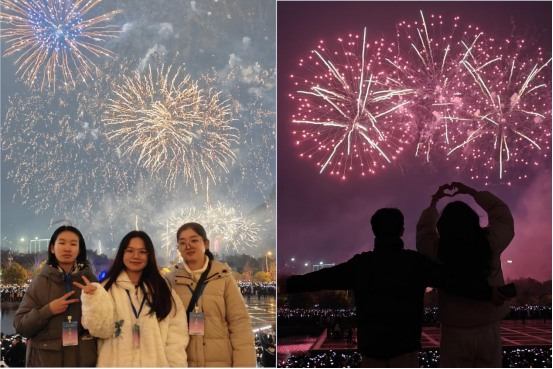 学生观赏烟花秀合影