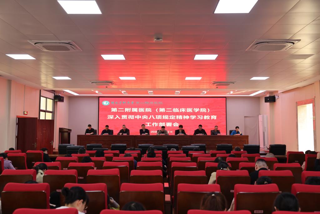 4月2日,桂林医科大学第二附属医院(第二临床医学院)在9号楼3楼会议室召开深入贯彻中央八项规定精神学习教育工作部署会议,医院全体院领导、中层干部和支部书记出席会议。会议由党委副书记、院长莫碧文主持。