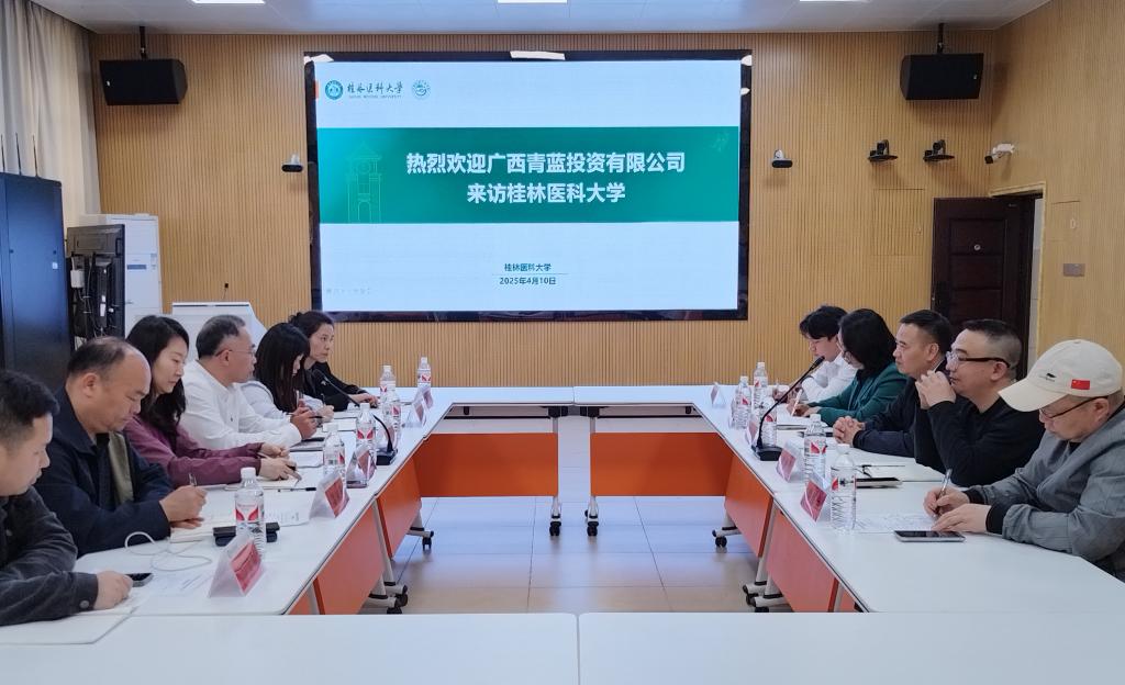 4月10日,广西青蓝投资有限公司总经理覃家明等一行到我校生物医药产业学院交流产学研合作,科技处、生物医药产业学院和雁山区人民政府相关人员参加交流讨论。