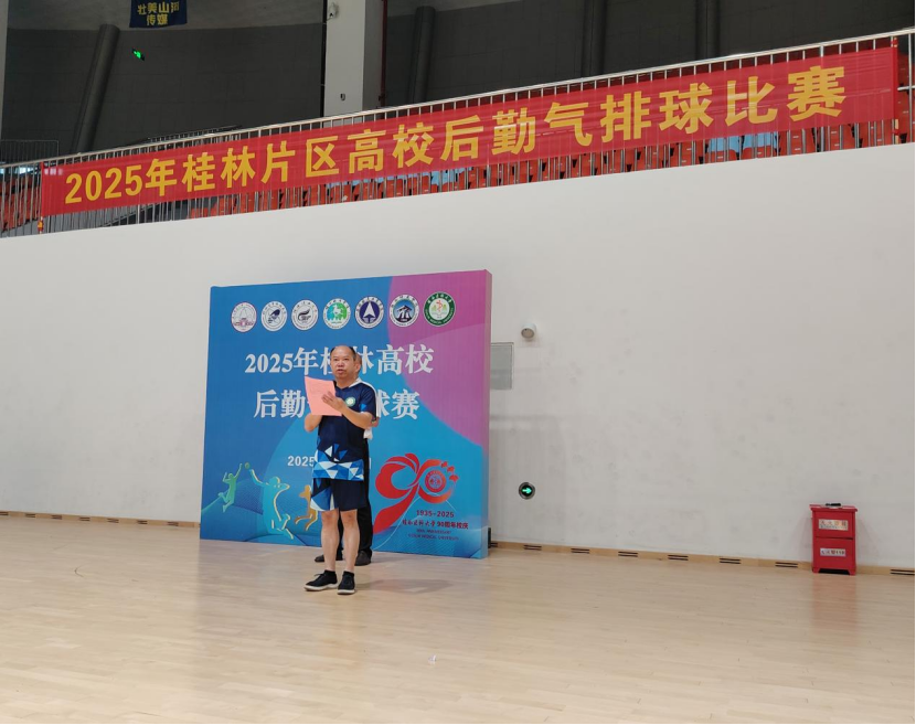 我校副校长覃克强出席赛事并致辞。他首先向桂林各高校后勤同仁们的到来表示热烈的欢迎。他指出,气排球运动以其独特的魅力,成为展现团队精神的绝佳载体。这次比赛为桂林各高校后勤职工提供了一次难得的交流与学习的机会,不仅是体能与技巧的较量,更是智慧与意志的比拼和展示自我的平台。