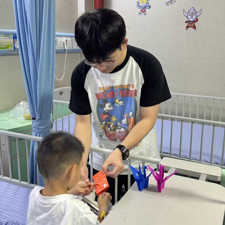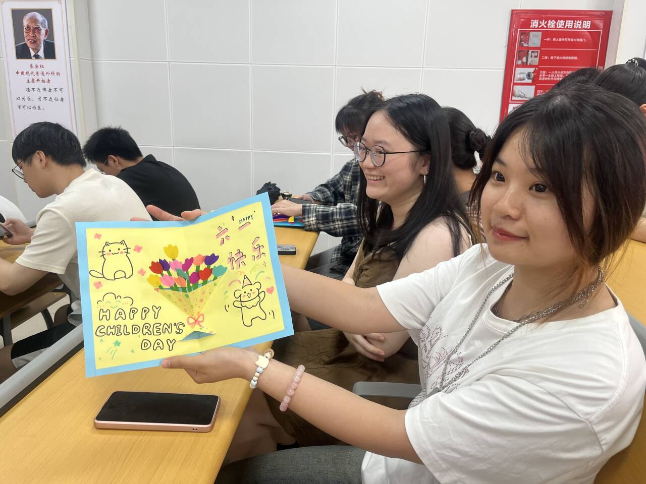 在医院多媒体教室,劳动教育课授课老师敬晓娟指导2022级临床医学本科南溪班学生分组制作手工贺卡。制作过程中,学生发挥创意,交流创作思路,现场氛围融洽。作品制作完成后,学生来到儿科病房,将贺卡送给住院患儿,祝愿他们早日康复、快乐成长。