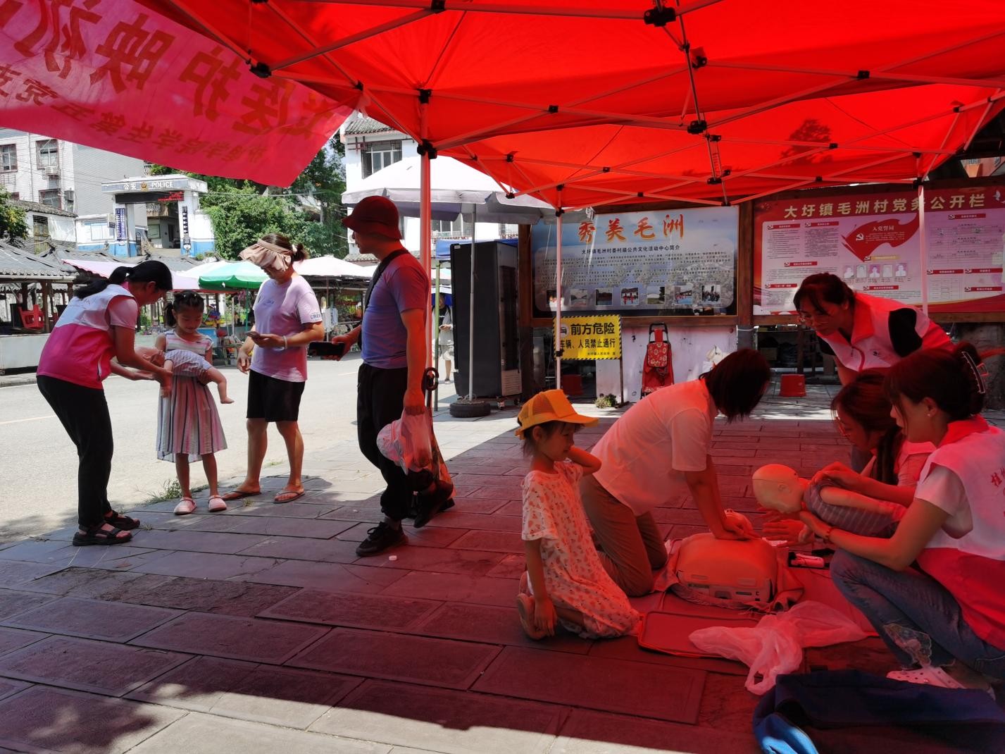 在大圩镇中心街道,师生党员针对暑期高发风险,开设“党建+公众自救”移动课堂。通过模拟人演示、情景互动等形式,手把手教授民众心肺复苏术、海姆立克急救法等技能,并向群众宣讲防溺水和防中暑科普知识,将“健康中国”战略落实到街头巷尾。