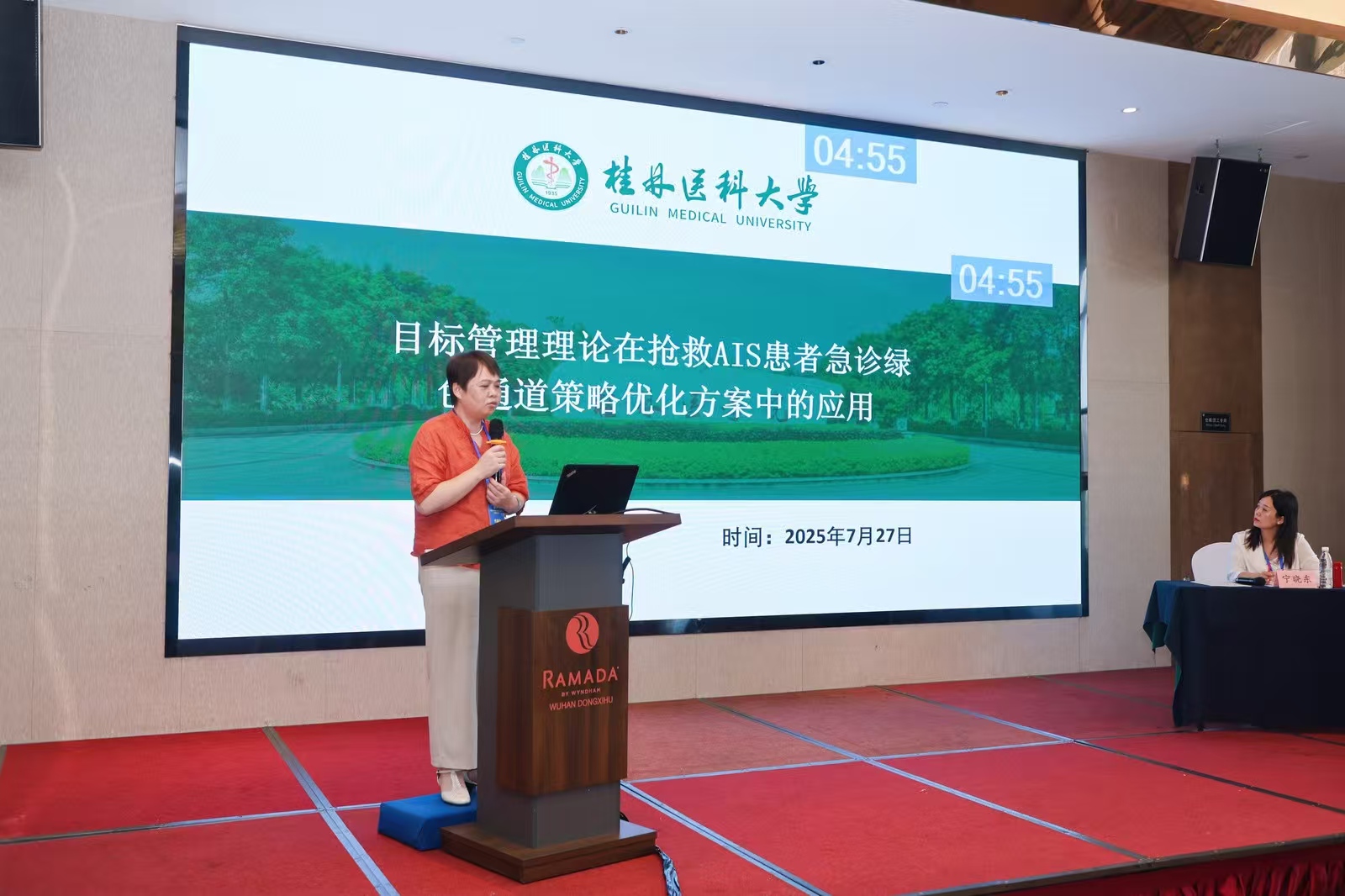 会议从1500余篇征文中遴选出132篇高质量论文,推选其作者进行汇报交流。容桂荣通过PPT讲解和视频播放形式,汇报其论文《目标管理理论在抢救AIS患者急诊绿色通道策略优化方案中的应用》,展示我校第一附属医院多学科合作对急性脑卒中救治的成效,体现了我校护理学科与康复治疗学专业的深度融合,为探索护理专业在健康促进、功能康复等领域的应用拓展了思路。